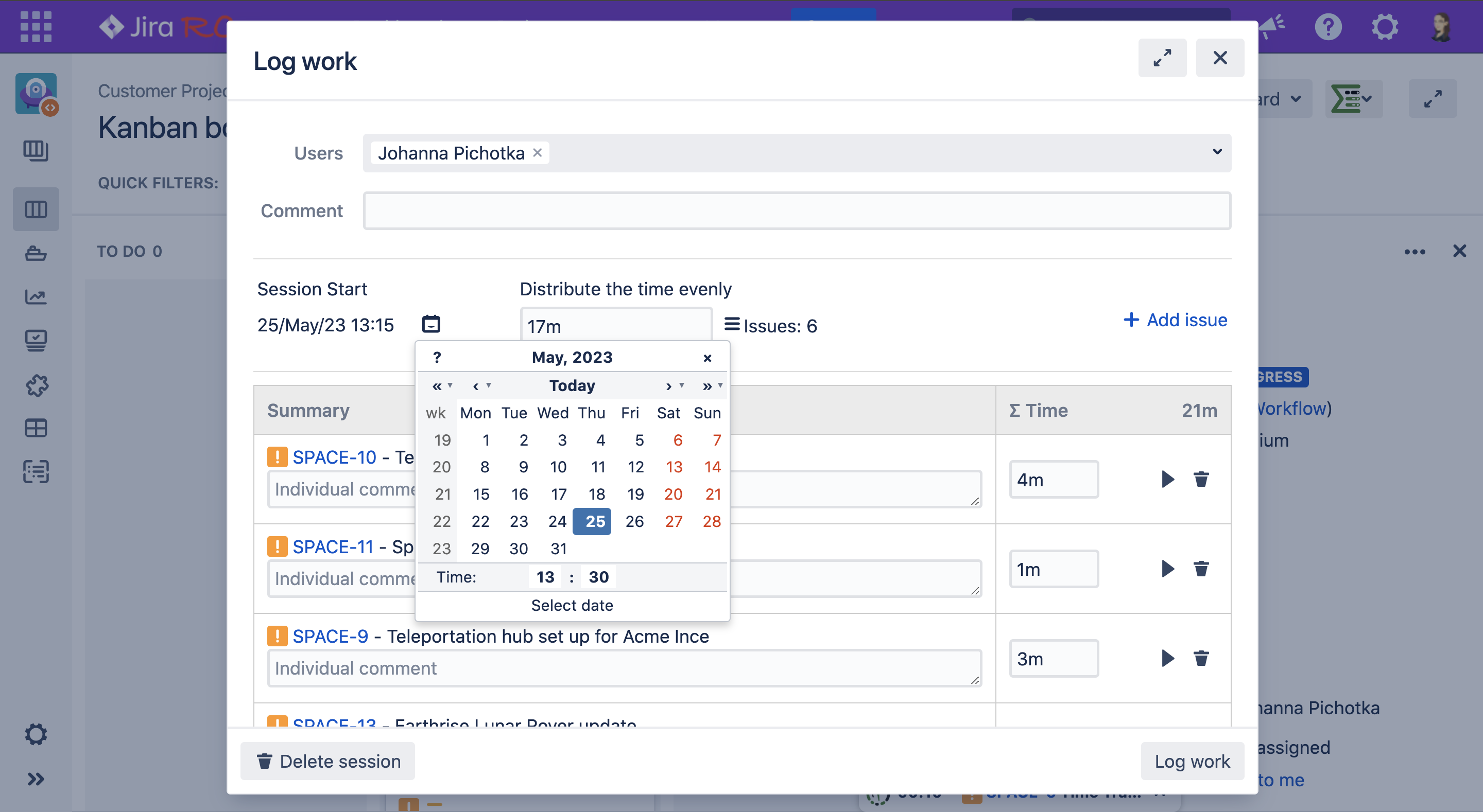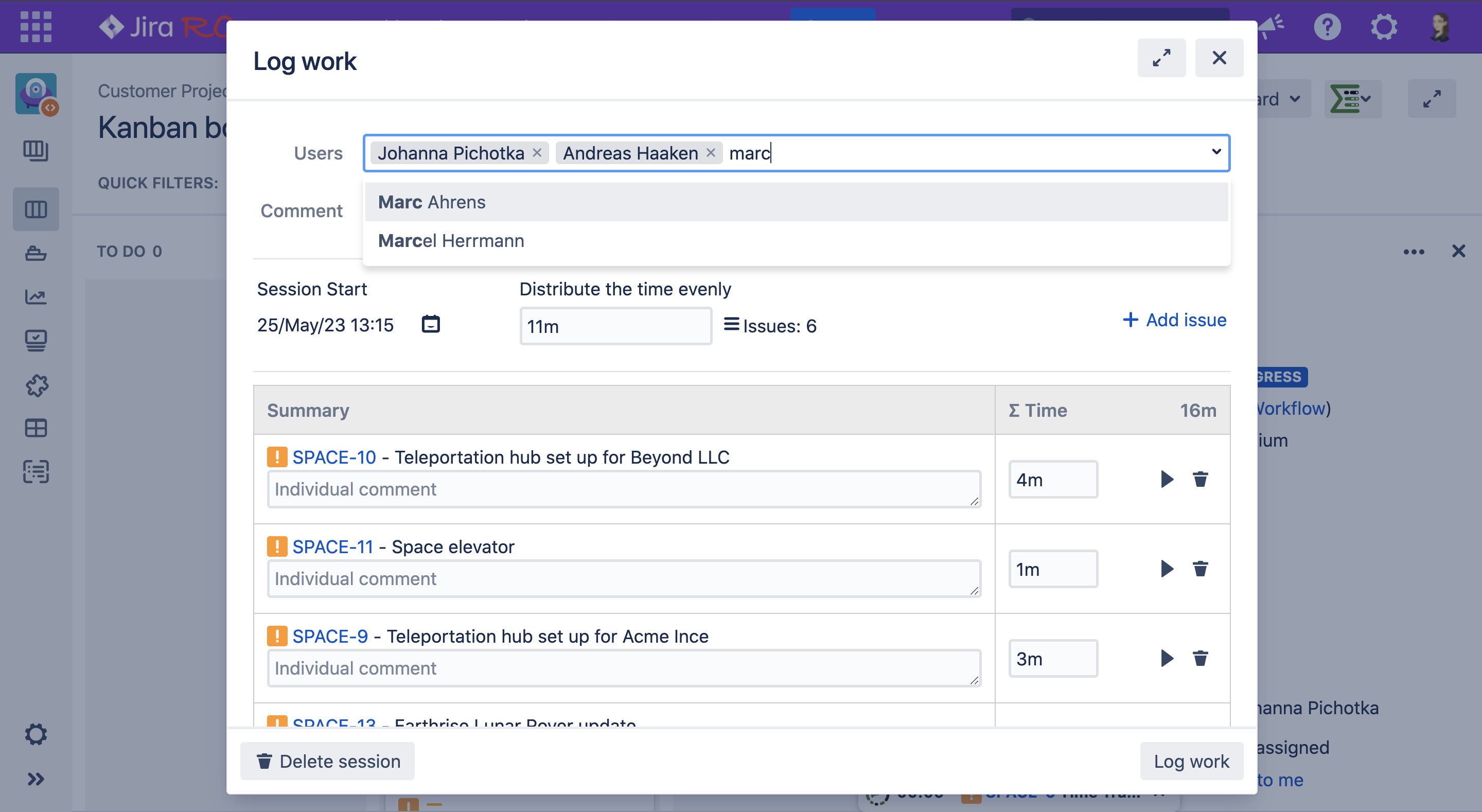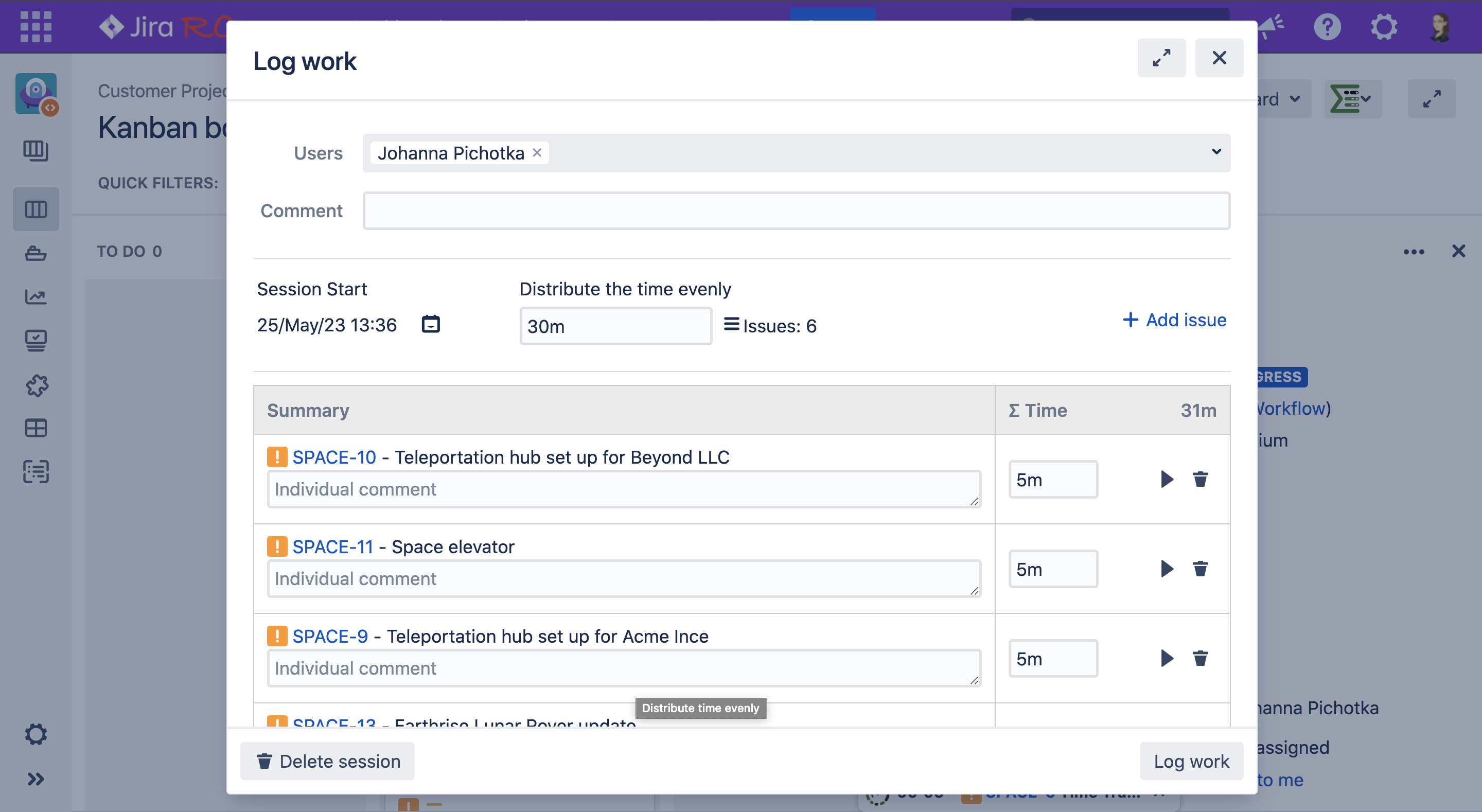 To distribute the time of your entire session evenly across all issues you first type in the complete time you want to distribute and then make sure you have all your issues selected. As a last step click on the menu next to the field and the time will be evenly distributed.